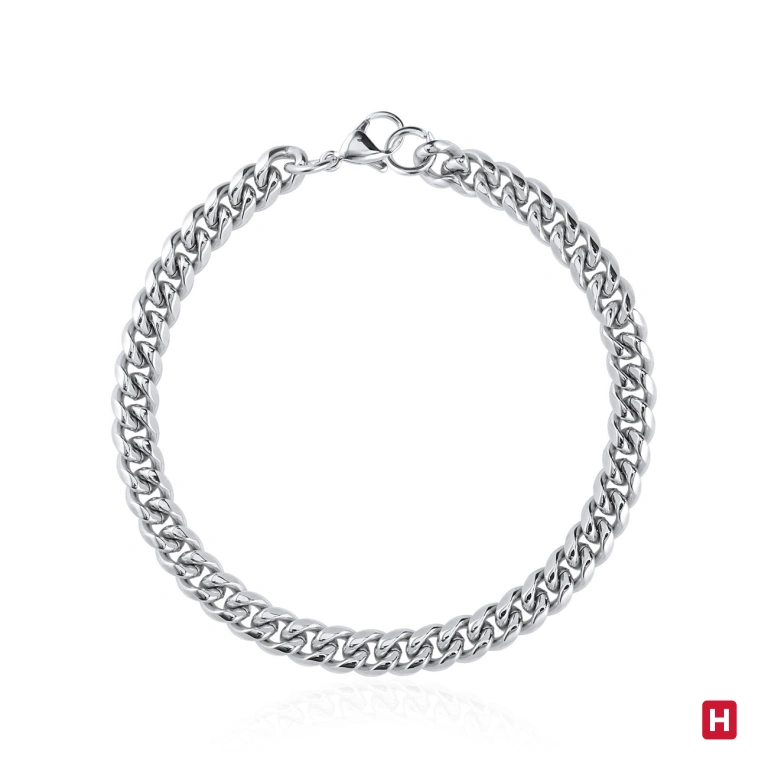Pulseira em aço cirúrgico, antialérgica com malha de barbela com uma espessura de 6,3mm.